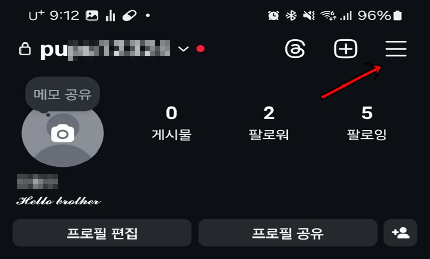 프로필에 들어가시면 오른쪽 상단의 "메뉴"를 클릭해 주세요.