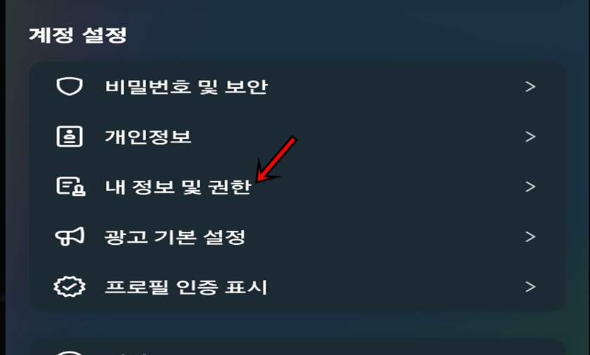계정 설정 메뉴 중에 "내 정보 및 권한"메뉴를 클릭해 주세요.