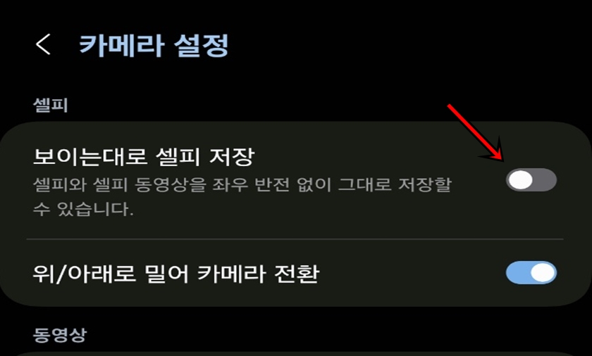 보통 셀카를 찍을 때 좌우가 바뀌어서 찍히게 되는데, 좌우반전을 설정하면 사진이 더 자연스럽고 부드러운 이미지를 만들 수 있어요. 격자 설정과 마찬가지로 카메라 설정에 들어오시면 위 사진처럼 셀피 항목에서 "보이는 대로 셀피 저장"을 활성화해 주시면 돼요 간단하죠?
