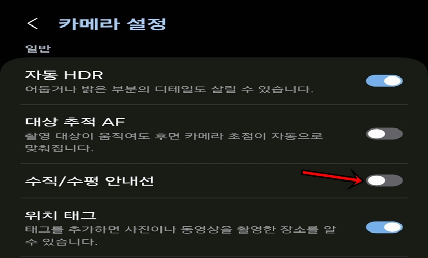 카메라 설정메뉴로 들어오시면 일반 항목에서 "수직/수평 안내선"이 비활성화되어 있는데 활성화를 해주세요.