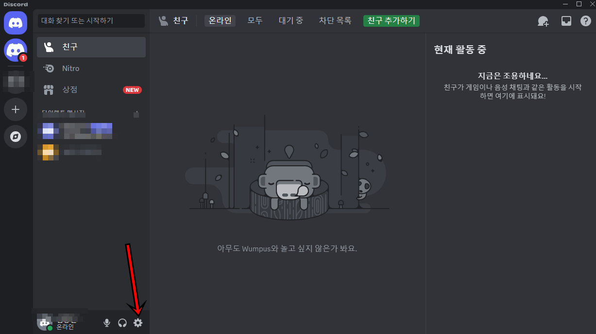 먼저 디스코드 프로그램을 실행하시면 위 사진과 같이 왼쪽 하단의 여러분의 이름옆에 "톱니바퀴" 설정메뉴가 보이실거에요. 설정메뉴를 클릭해서 들어가 주세요.