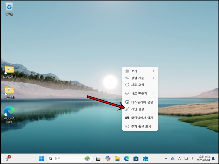 바탕화면의 마우스 우 클릭 후 "개인 설정"메뉴로 들어가 주세요.