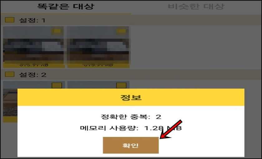 중복된 사진을 찾으면 위 사진과 같이 확인창이 나오는데 확인버튼을 클릭해 주세요.