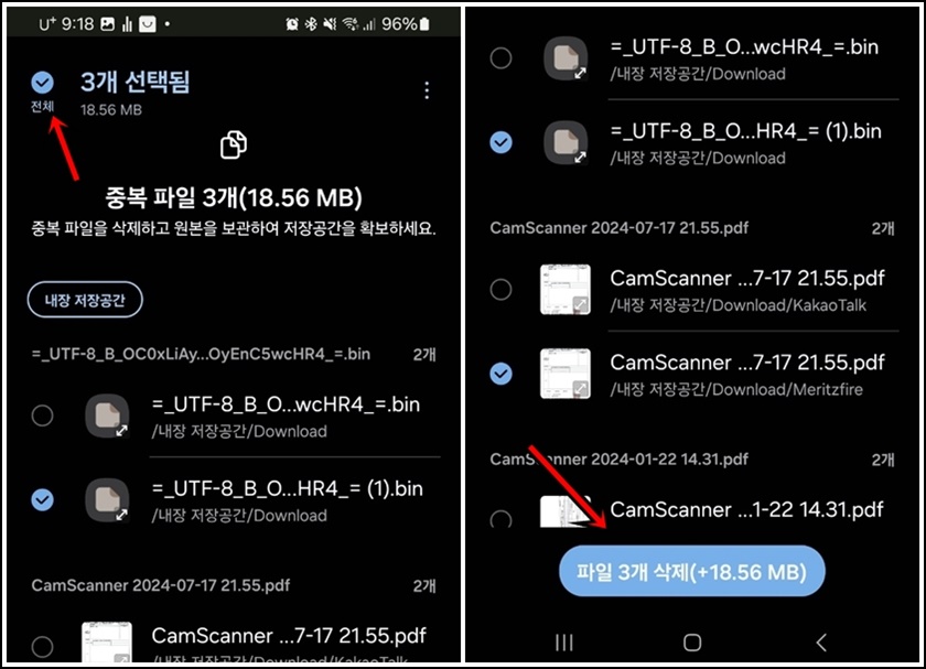중복파일에 들어오시면 상단의 "전체"를 클릭 후 하단에 "파일 삭제"버튼을 클릭하여 중복된 파일을 삭제해 주세요.