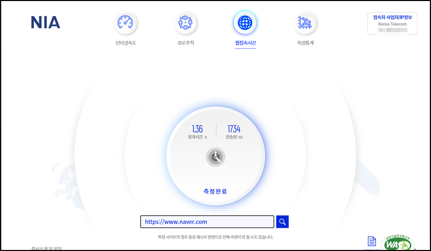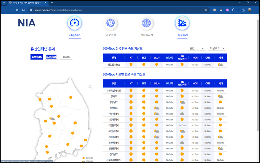 NIA 인터넷 품질 측정사이트에 접속하시면 측정통계를 클릭해 보면 각 인터넷 서비스 제공자(ISP)의 품질을 비교할 수 있는 정보를 확인할 수 있어요.