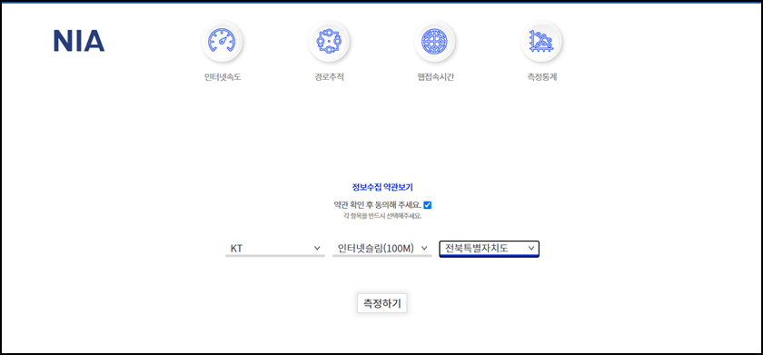 설치가 완료되면 위 사진처럼 몇 가지 기본정보를 입력해야 해요. 여러분이 사용하시는 통신사, 인터넷 상품명, 거주지역등의 기본정보를 입력 후 "측정하기"를 클릭해 주세요.