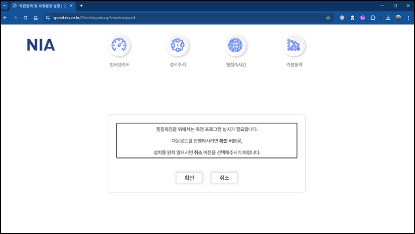 자 인터넷 속도 측정을 하기 위해 상단의 "인터넷 속도"메뉴를 클릭하시면 품질측정을 위해서 프로그램이 설치되어야 해요. 다운로드를 진행해주세요.