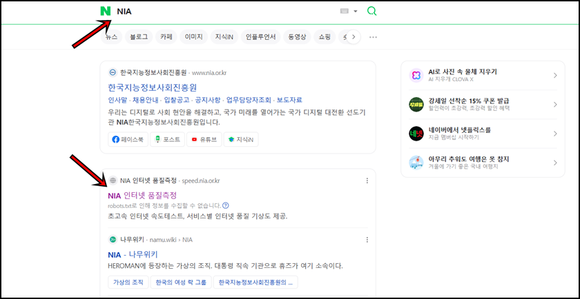 오늘 제가 소개해드릴 인터넷 속도 측정방법은 "NIA 인터넷 품질 측정(한국지능정보사회진흥원)"에서 제공하는 유선 인터넷 속도 측정 도구예요. 초고속 인터넷 속도테스트는 물론, 서비스별 인터넷 품질 기상도 확인가능해서 많은 분들이 이용하는 인터넷 속도 측정도구 중 하나예요. 먼저 속도 측정을 하려면 인터넷 검색창에 "NIA"만 검색하시면 위 사진처럼 NIA 인터넷 품질 측정 웹페이지가 나올 텐데 클릭해서 들어가 주세요.