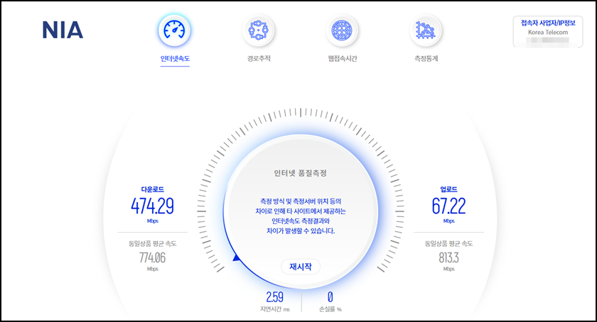 정보를 입력 후 측정하시면 잠시 뒤면 여러분의 인터넷의 다운로드/업로드, 지연시간, 손실률 등을 확인할 수 있어요.