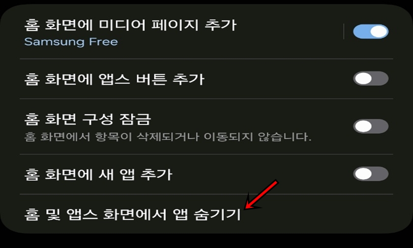 다시 "홈 및 앱스 화면에서 앱 숨기기"메뉴를 클릭해 주세요.