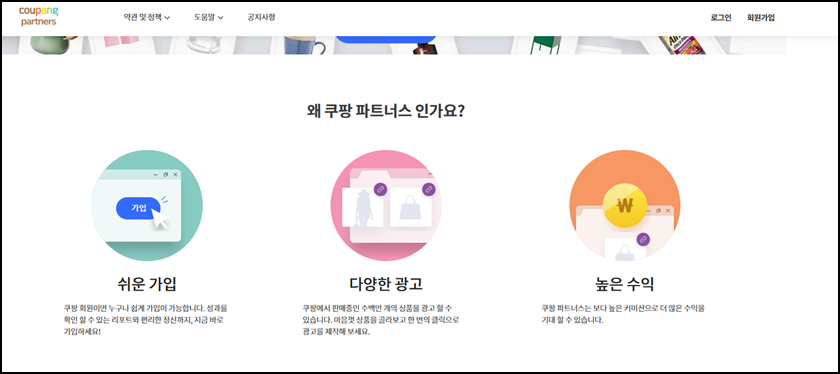 먼저 아래 링크를 클릭하여 쿠팡 파트너스로 이동해 "회원가입"을 진행해 주세요.