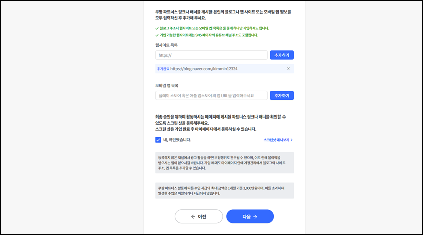 회원가입 시 웹사이트목록에 여러분들의 "네이버 블로그"주소를 입력 후 추가를 클릭하시고 "다음"으로 넘어가주세요.