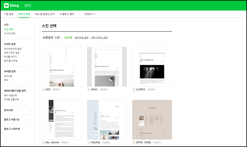 자 이제 여러분의 네이버 블로그로 이동 후 관리 -> 꾸미기 설정 -> 레이아웃, 위젯 설정 메뉴를 클릭해 주세요.