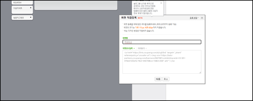 위젯 직접등록 창이 활성화되면 위젯명을 입력 후 아까복사했던 HTML을 위젯코드 입력란에 붙여 넣기 후 "다음"으로 넘어고 등록을 진행해 주세요.
