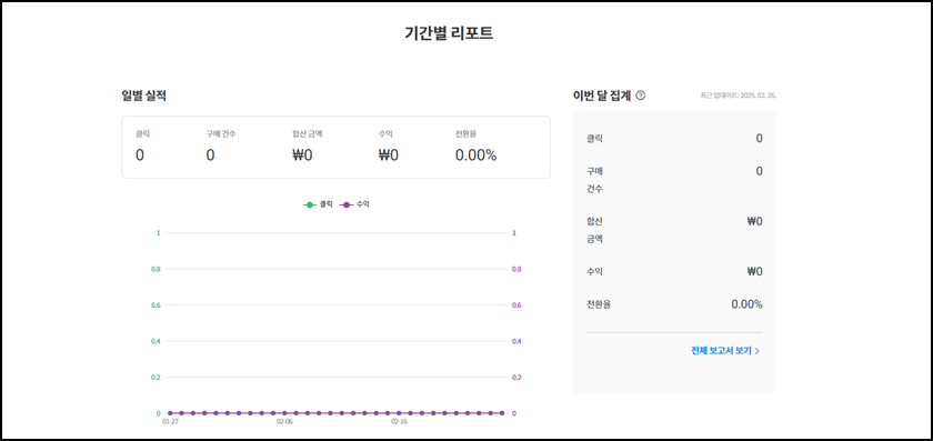 수익의 경우 쿠팡파트너스 메인페이지에 가보시면 위 사진처럼 확인할수 있는데, 광고 클릭만으로는 수익이 발생하지 않고 광고를 클릭 후 구매까지 이루어져야 수익이 발생한다고 해요. 사실 광고 클릭후 구매까지 하는 분들이 얼마나 될진 모르겠지만 한 명의 블로그방문자라도 해당 광고를 통해 구매하게 되어 적립하게 된다면 쏠쏠한 수익을 얻을 수 있을 것 같긴 해요.