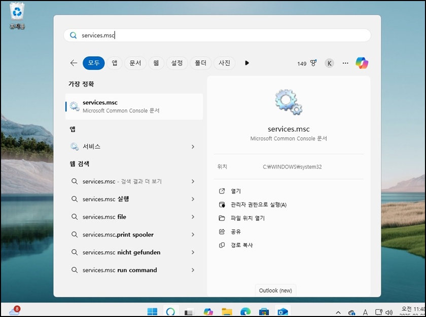 다음은 서비스를 활용하여 윈도우11 자동업데이트 끄는 방법이에요. 실행창에 "service.msc"를 검색하셔서 서비스를 관리자권한으로 실행해 주세요.