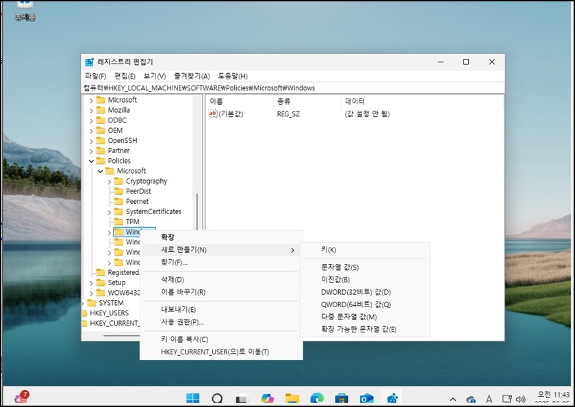 경로는 "컴퓨터\HKEY_LOCAL_MACHINE\SOFTWARE\Policies\Microsoft\Windows"로 이동후 Windows폴더에 마우스 우클릭 후 "새로 만들기" -> "키"를 선택해 주세요.