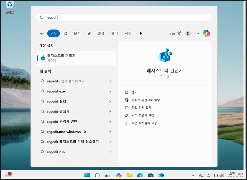 먼저 윈도우11 실행창에 "regedit"를 검색하셔서 레지스트리 편집기를 관리자 권한으로 실행해 주세요.