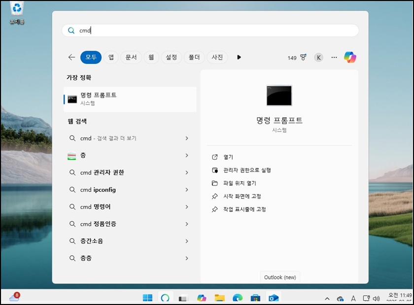 마지막으로 명령프롬프트를 활용하여 윈도우11 자동업데이트를 끄는 방법이에요. 실행창에 "cmd"를 검색하셔서 명령프롬프트를 관리자 권한으로 실행해 주세요.