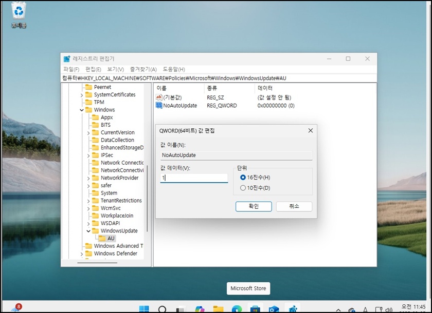 NoAutoUpdate를 더블클릭하신 뒤 값 데이터를 "1"로 설정 후 확인버튼을 클릭해 주세요. 이렇게 설정이 완료가 되면 윈도 11 자동업데이트가 영구비활성화 되요. 단 윈도우 업데이트로 들어가셔서 수동업데이트를 확인하고 다운로드는 진행하실수 있어요.
