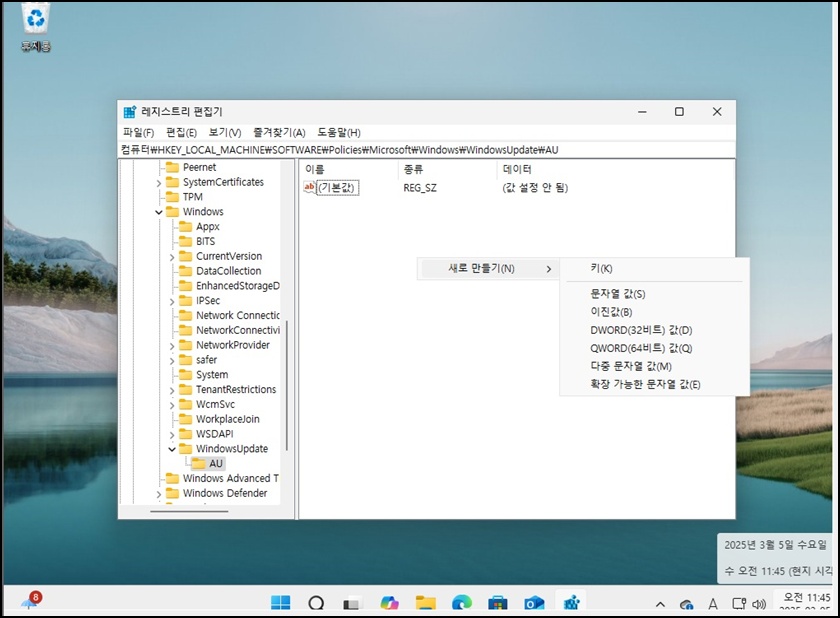 폴더가 만들어지면 해당 이름을 "WindowsUpdate"로 변경하시고 해당 폴더에 마우스 우클릭하여 "새로 만들기" -> "키"를 클릭하시고 폴더이름을 "AU"로 설정해 주세요.