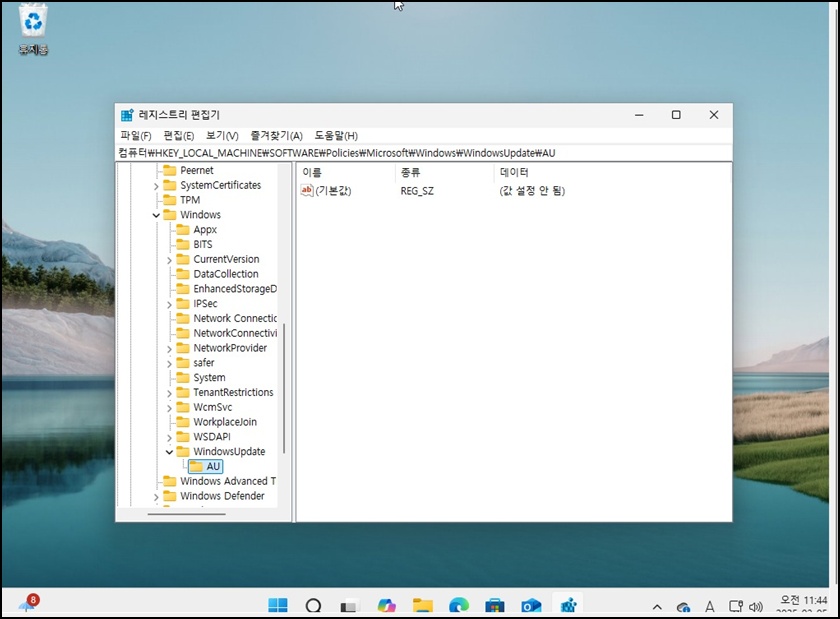컴퓨터\HKEY_LOCAL_MACHINE\SOFTWARE\Policies\Microsoft\Windows/WindowsUpdate/AU 가 맞는지 확인해 주세요. 위 사진처럼 돼야 해요.
