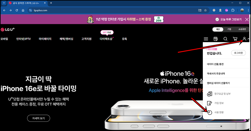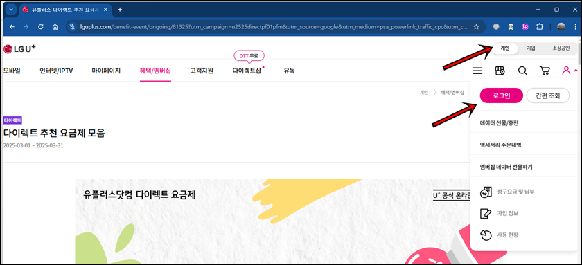 먼저 유플러스 홈페이지에 접속후 오른쪽 상단에 "로그인"을 진행해 주세요.