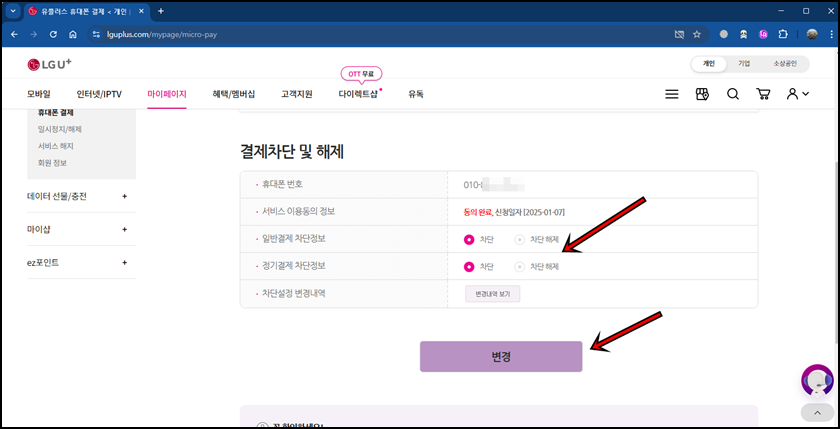 위 사진과 같이 일반결제, 정기결제 부분을 차단으로 설정하시고 "변경"으로 클릭하시면 소액결제가 차단이 돼요? 아주 쉽죠?