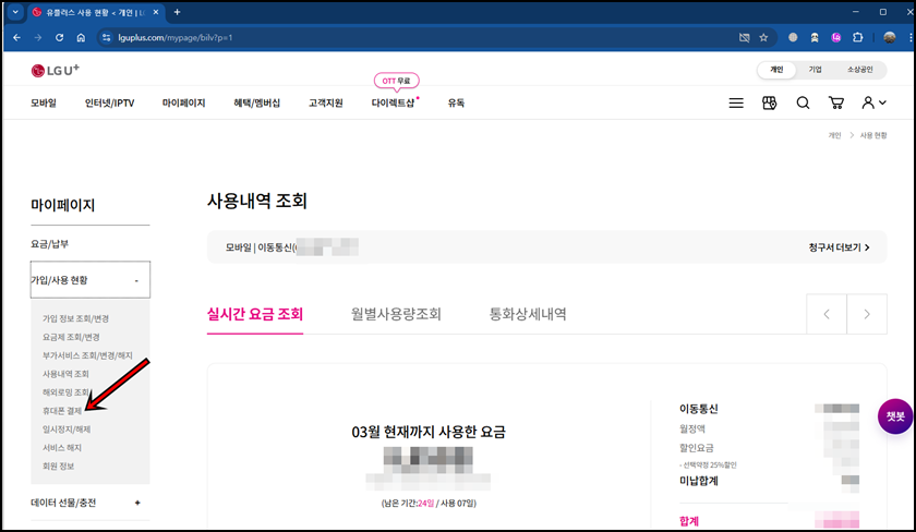 왼쪽 마이메뉴에서 "휴대폰 결제"메뉴를 클릭해 주세요.