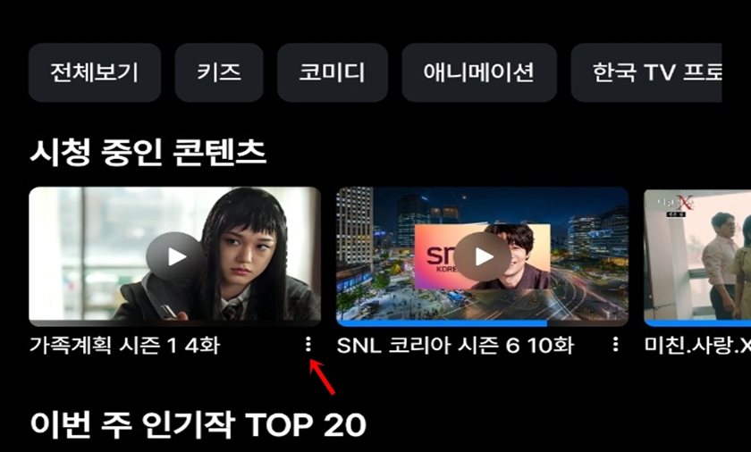 쿠팡플레이 로그인하시면 위 사진처럼 "시청 중인 콘텐츠"가 나올 텐데, 영상을 보다가 중간에 끊거나 한 번이라도 본 영상 등을 확인할 수 있어요. 만약 시청 중인 콘텐츠를 삭제하고 싶으시다면 위 사진처럼 영상의 [...] 메뉴를 클릭해 주세요.