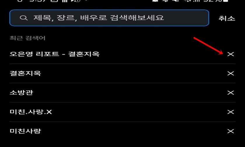 여러분들이 쿠팡플레이에서 검색하셨던 검색기록등을 확인할 수 있어요. 검색어 오른쪽에 X를 클릭하게 되면 검색기록이 삭제가 돼요.
