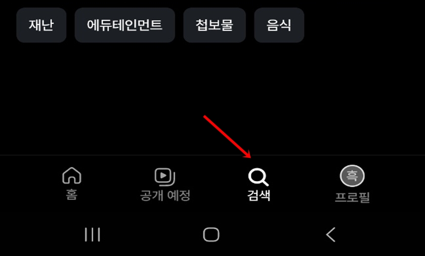 다음은 검색기록 삭제하는 방법이에요 쿠팡 플레이 하단의 돋보기 모양 "검색"메뉴를 클릭해 주세요.