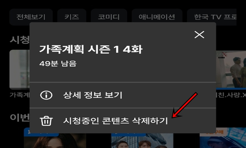"시청 중인 콘텐츠 삭제하기"를 클릭하면 내가 시청한 영상 목록에서 삭제가 돼요. 간단하죠?