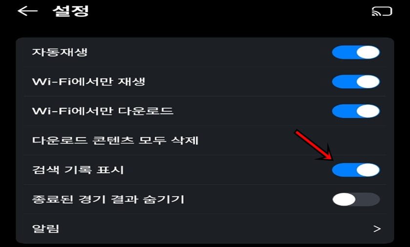 설정메뉴로 들어오시면 "검색 기록 표시"가 활성화되어 있을 텐데, 클릭하여 비활성화해주시면 앞으로 검색기록은 저장하지 않게 돼요. 참 쉽죠?