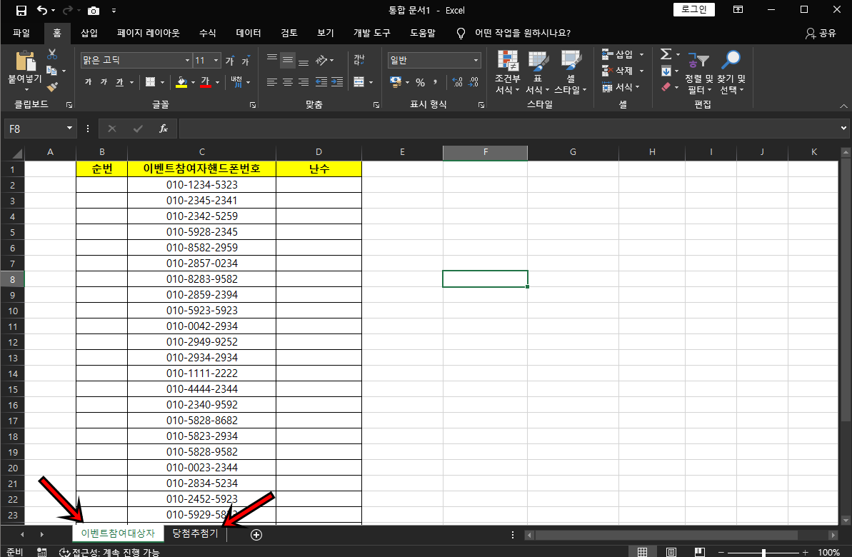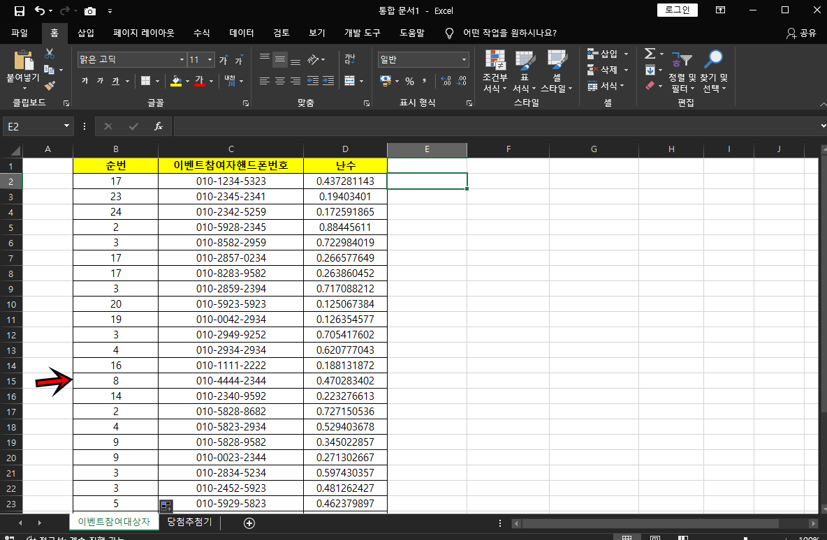 위와같이 이벤트 참여자가 있다고 가정해 볼게요. 이 이벤트 참여자 중 1등, 2등, 3등, 보너스 당첨자까지 랜덤으로 추첨을 하려고 해요. 우선 확인하기 쉽게 첫 번째 시트는 이벤트 참여자대상자 리스트, 두 번째 시트는 당첨자추첨기를 적용해 보도록 할게요. 참여자리스트는 이름이나 번호 같은 경우는 중복될 수 있기에 고유번호(핸드폰번호, 주민번호, 학번)등이 좋겠죠?