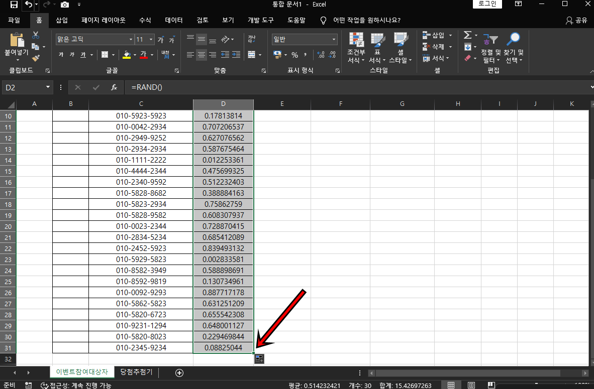 채우기 핸들을 통해 나머지 셀들도 적용해 주세요. F9를 클릭했을 때 난수의 값이 랜덤으로 변경되면 잘 적용된 거예요.