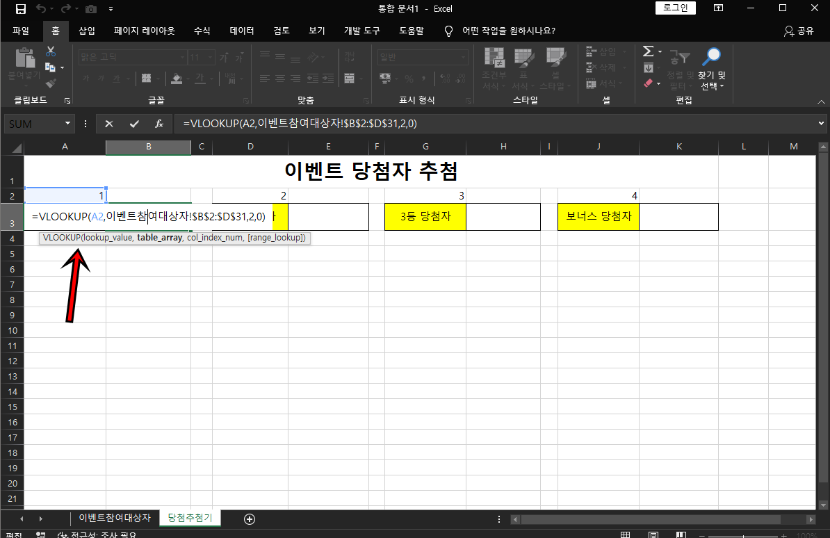위 1등 당첨자 함수는 즉 =VLOOKUP(A2(참조숫자가 있는 셀), 이벤트참여대상자!(시트이름)$B$2:$D$31(값이 있는 열번호),2,0 값 일치조건))이예요