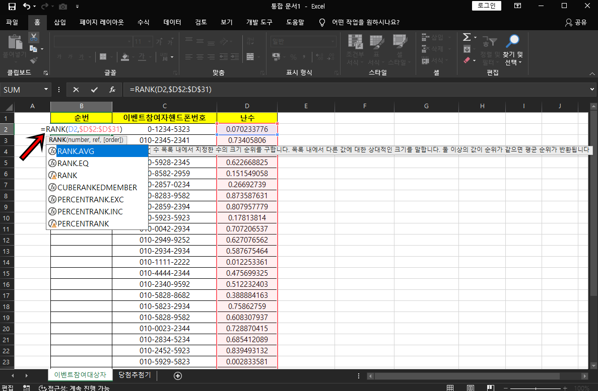 위 사진의 경우 =RANK(D2,$D$2:$D$31) 난수값 전체범위는 $절대참조를 적용해 주시고 Enter를 쳐주세요