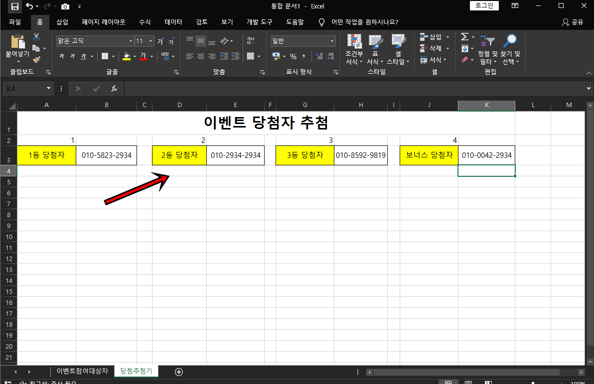먼저 위와 같이 당첨자 순위 항목을 만들어주세요. 그리고 당첨자 셀 위나 아래에 순위를 적어주세요