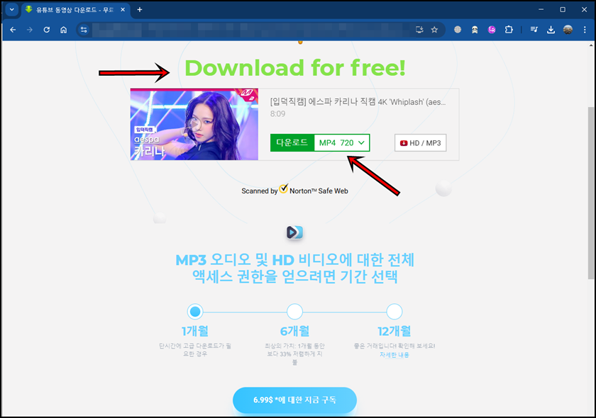 이제 위 사진처럼 "Download for Free!"가 뜨면서 아래 하단의 동영상 "다운로드"버튼이 보이실 거예요. 다운로드버튼을 클릭해 주세요. 몇번 새로운 창이 뜰텐데 그냥 무시하고 닫아주세요.