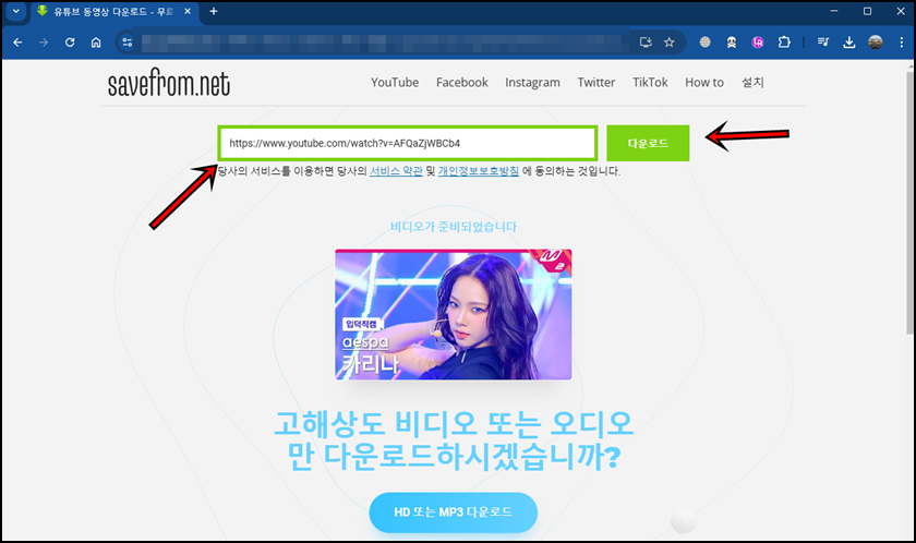 자 그러면 savefrom.net이라는 사이트로 접속이 되며 복사한 URL이 자동으로 등록될 텐데, 위 사진처럼 "다운로드"버튼을 클릭해 주세요. 몇 번 새로운 창이 뜰 텐데 그냥 무시하고 닫아주세요.