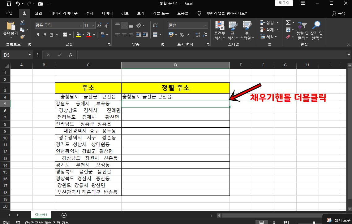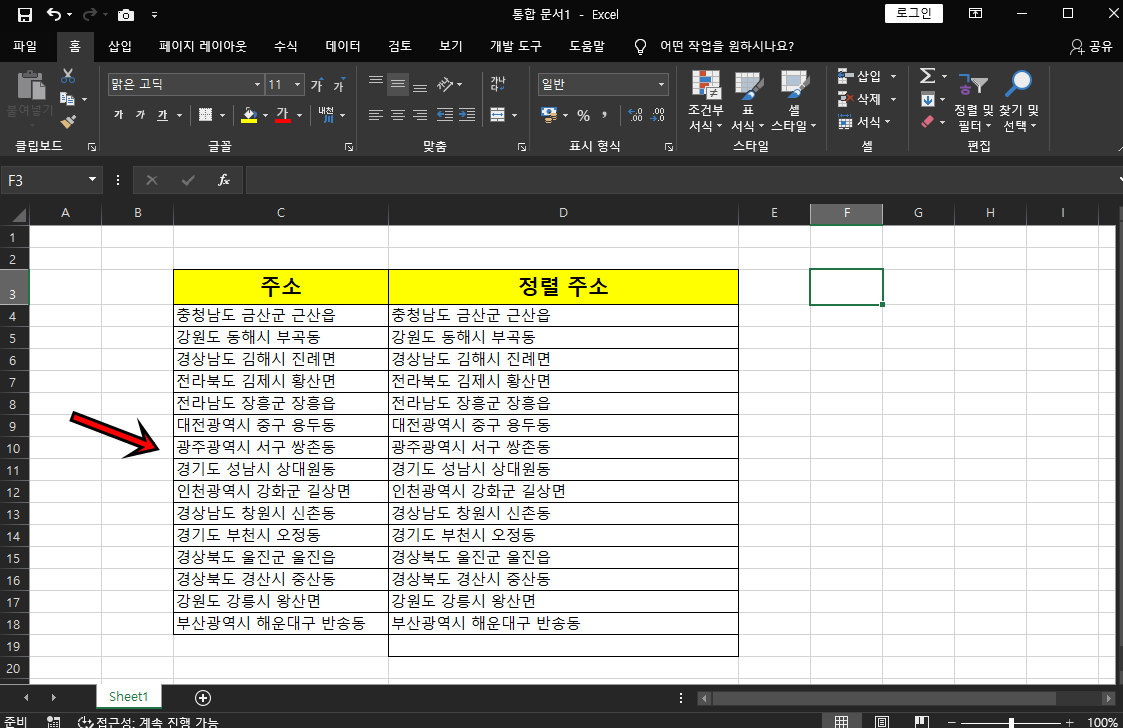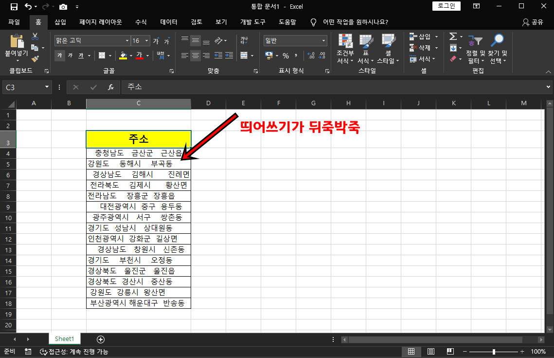 나머지 셀들도 적용이 되어서 불필요한 빈 공간이 지워지면서 주소정렬이 됐어요.