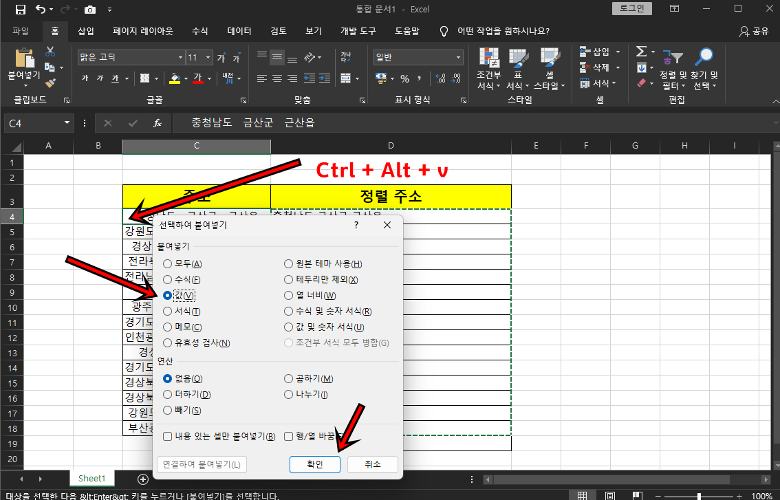 C4셀에 Ctrl + Alt + v를 해주시면 "선택하여 붙여 넣기"창이 활성화될텐데, 붙여넣기 항목은 "값"으로 선택 후 "확인"버튼을 클릭해 주세요.