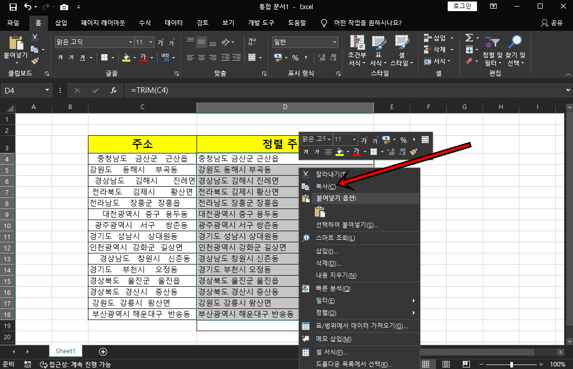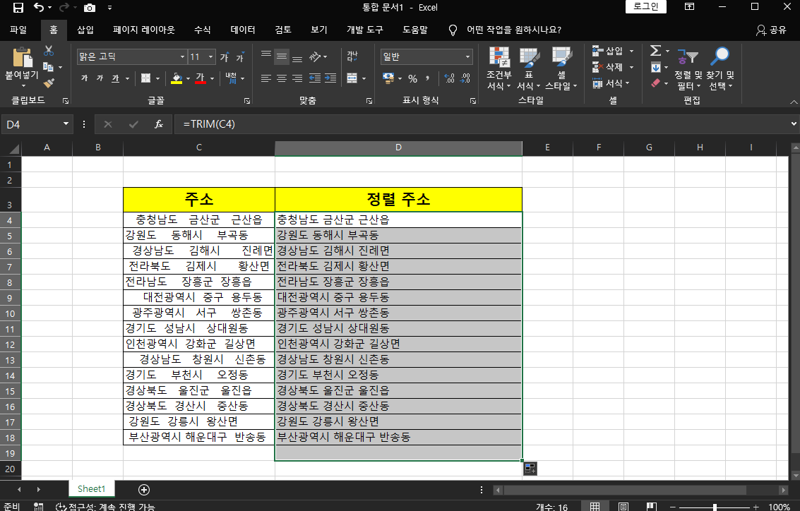 짜잔!! 주소 정렬이 완벽하게 되었어요. 굳이 하나씩 빈 공간을 지우면서 막일 작업할 필요 없이 TRIM함수로 한 번에 정리가 되었죠? 참 쉽지요!!