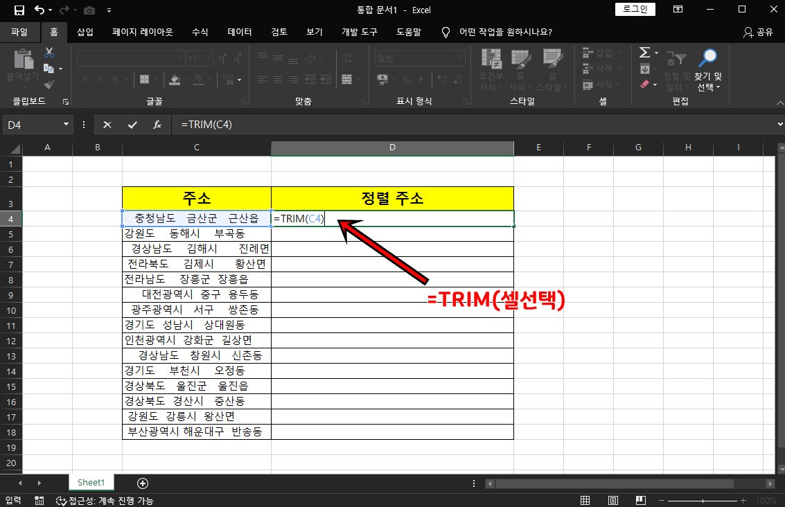 자 먼저 주소 오른쪽에 =TRIM(셀선택)을 해주시면 끝이 나요. 위 예제는 =TRIM(C4)겠죠? 자 그럼 Enter를 쳐보세요.