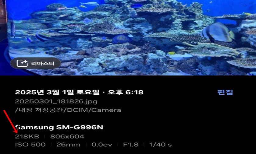 다시 사진의 속성을 확인해 보시면 사진 용량이 218KB로 확 줄어든 걸 확인하실 수 있어요. 대단하죠?
