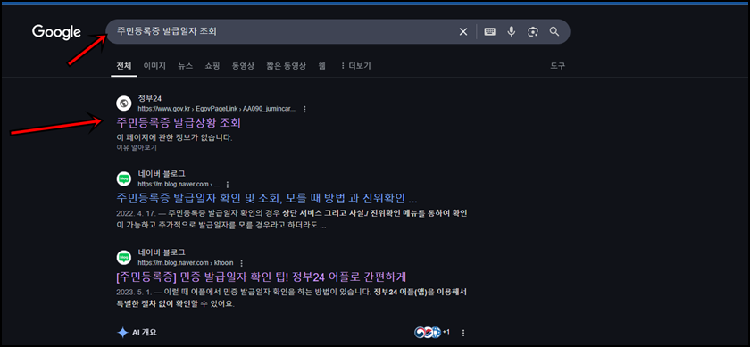 먼저 PC 구글 검색창에 "주민등록증 발급일자 조회"라고 검색하시면 정부 24 주민등록증 발급상황 조회라고 검색이 되실 거예요. 해당 검색을 클릭해서 들어가 주세요.