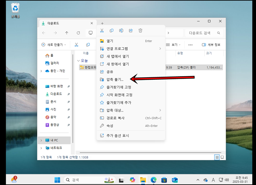 다운로드가 완료하셨다면 파일 우클릭하셔서 "압축 풀기"를 진행해 주세요.