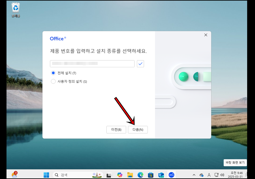 default로 제품키가 들어가 있으며 "전체 설치"를 클릭하여 "다음"으로 넘어가주세요.