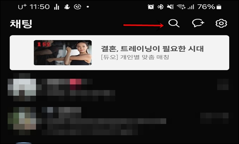 자 먼저 여러분의 스마트폰에서 카카오톡을 실행후 오른쪽 상단의 돋보기(검색) 메뉴를 클릭해 주세요.